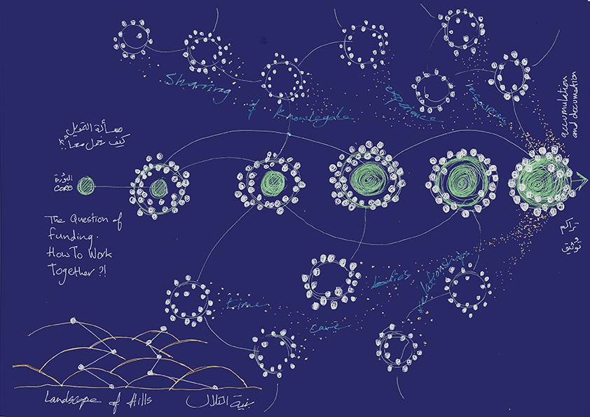 Within our collective, we are committed to changing the way we work on and think about cultural production and its funding mechanisms. In our projects, we prioritize the process itself and shift our positions as cultural practitioners to focus on infrastructure: how art and culture can liberate themselves from the economic infrastructure of the traditional institution and how to make use of the rich resources that exist in Palestinian society today.
